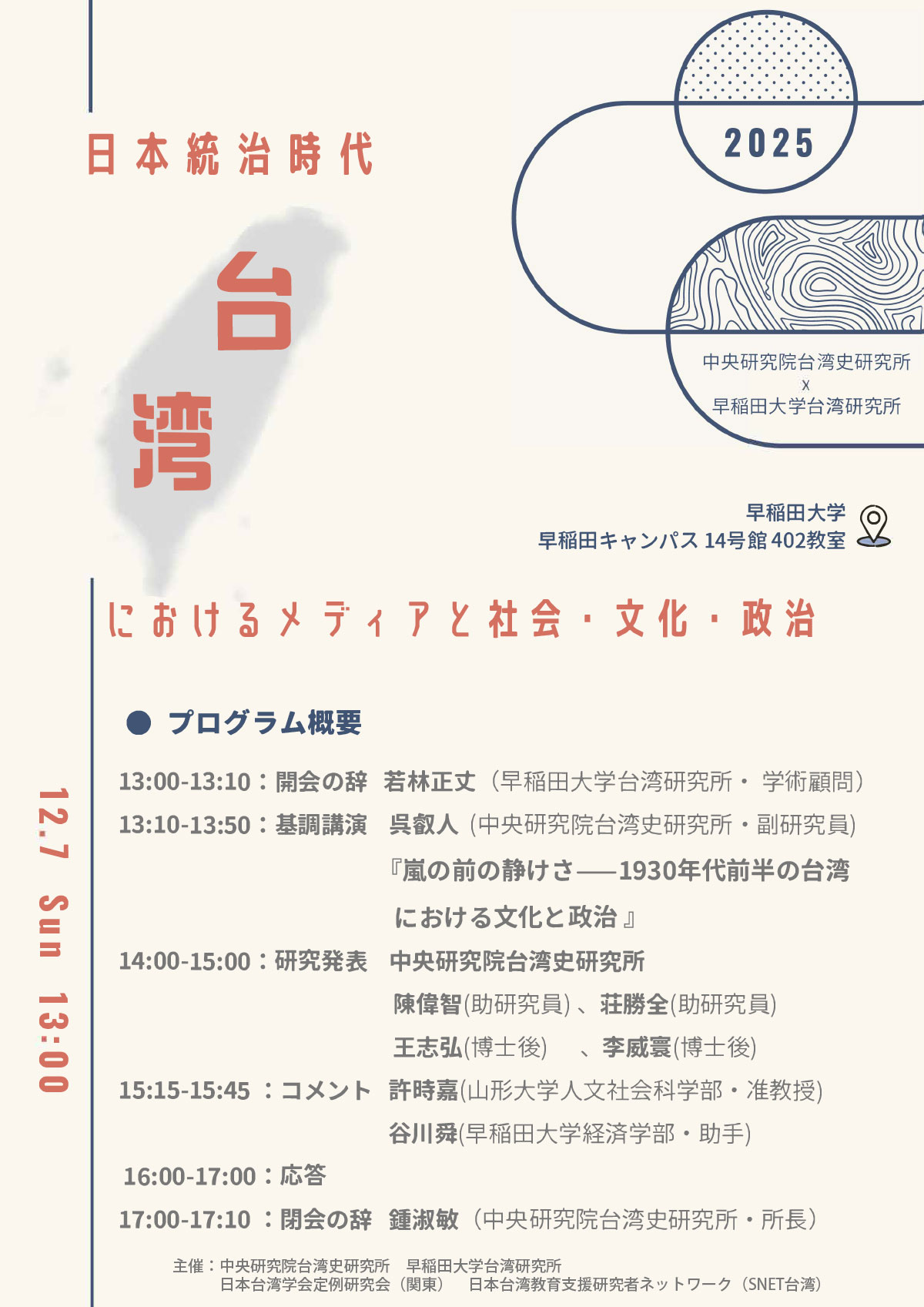 主催:早稲田大学社会科学総合学術院先端科学研究所台湾研究所・中央研究院台湾史研究所・日本台湾学会・Snet台湾